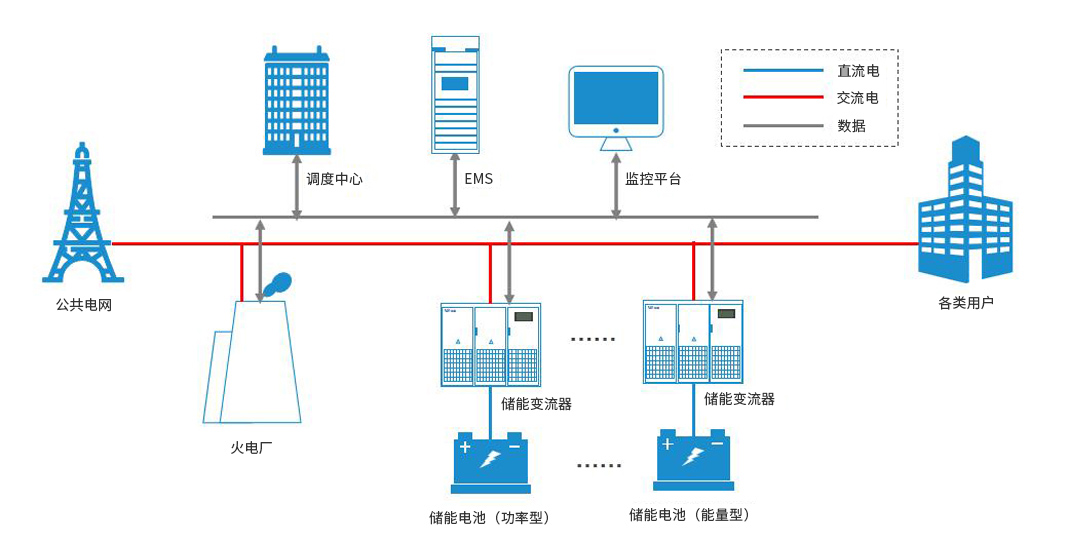 本方案用于电力辅助服务或传统电网升级方式变革,具体形式可为调峰调频电站、城市储能电站等。