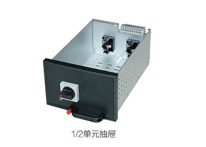 该柜型抽出式功能单元外形尺寸标准化程度高,高度尺寸采用25模数值,可组装成高度为150、200、300、400、60O等模数值内的单元抽屉。1/2单元抽屉配套使用电路分配转接器,可以制作高度为150、200的小单元抽屉。
