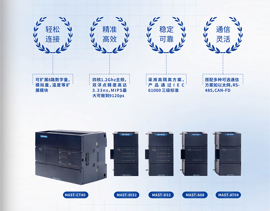 2、可提供至少20路通用数字I/O信号接口,具有一路10/100/1000M自适应以太网接口、RS485等通讯接口,该系列控制器可独立工作, 也可利用通讯接口与其它控制器、人机界面配合使用,实现功能更复杂、操作更便利的综合控制。