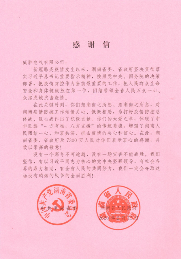 近期,威胜电气先后收到来自中共湖南省委、湖南省人民政府及湖南省工商业联合会的感谢信,信中表达了对威胜电气在疫情期间驰援一线善举的肯定与赞扬。