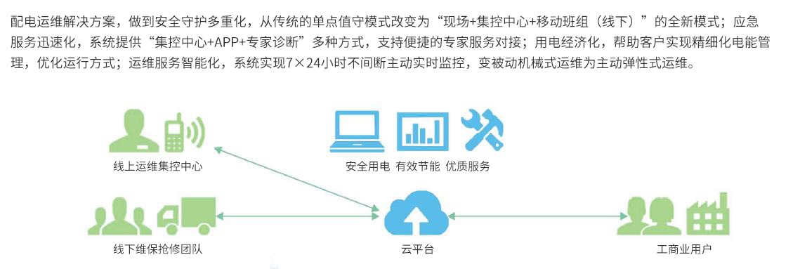 全新的配电一站式运维服务,采用线上监测分析加线下运维服务的模式,为广大用户提供变配电站智能化托管运维支撑服务、“企业电网云服务平台”解决方案、能效管理平台建设及运营管理、以及用户电力需求侧的各类增值服务。在使配电更安全、服务更高效的同时,降低能源消耗,提升用能效率。