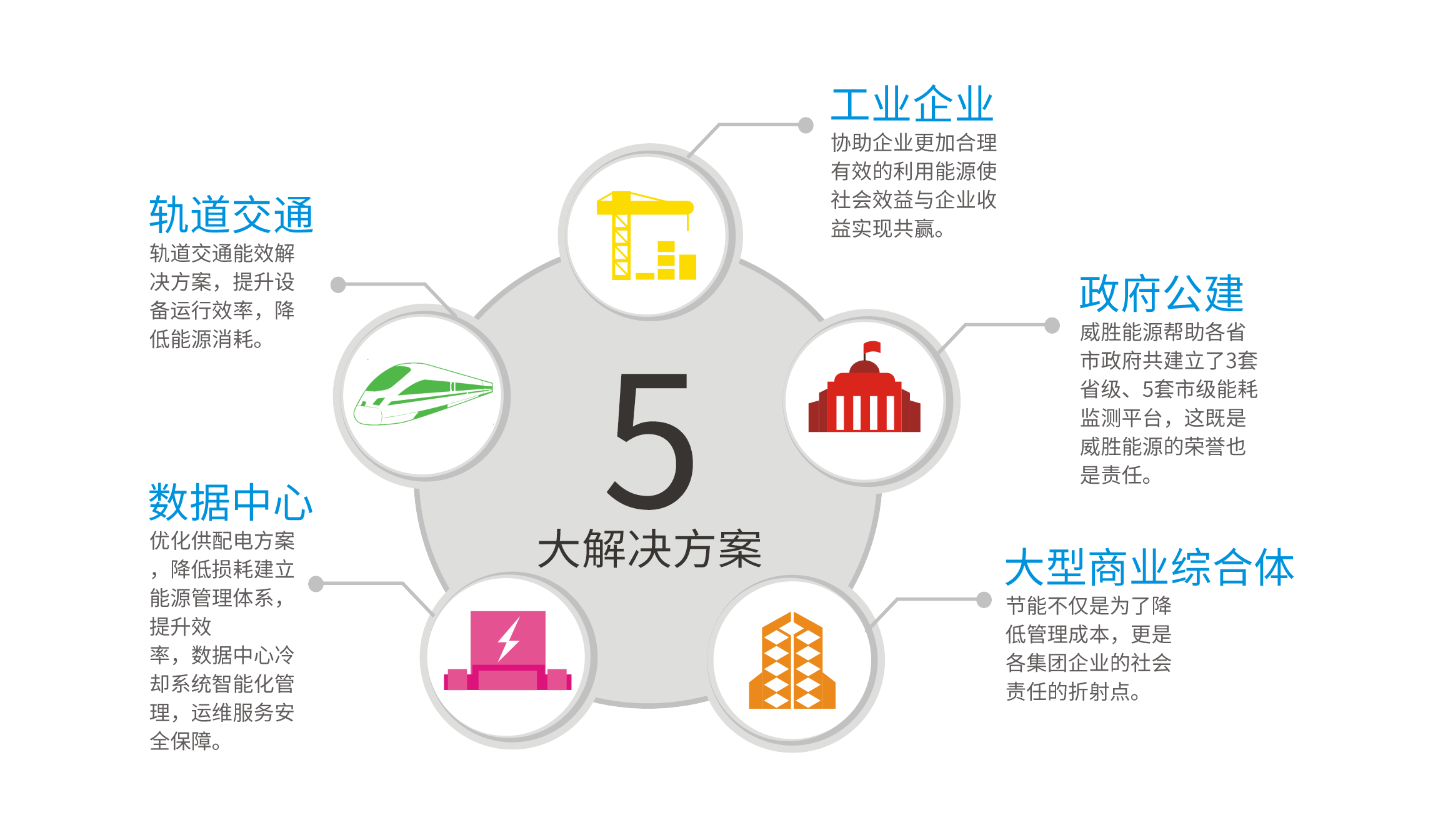 威胜的整体能效解决方案,是针对工业企业、轨道交通、数据中心、大型商业综合体、政府公建等大型用电客户构建的一套用能解决方案。该方案包括水、电、气、热等多种能源种类,以能源购入、能源存储、能源消耗等能源使用过程为导向的全生命周期用能管理方案,竭力帮助用户减少能源损耗、提高能源利用率。